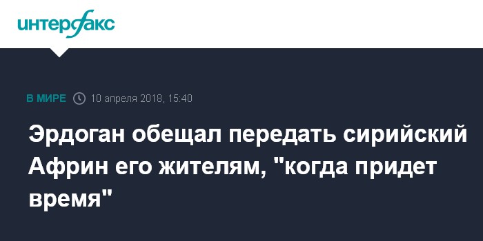 Москва. 10 апреля. INTERFAX.RU - Президент Турции Реджеп Тайип Эрдоган не согласился с главой МИД РФ Сергеем Лавровым, что оптимальным способом нормализации обстановки в сирийском Африне стал бы возврат этой территории под контроль Дамаска.