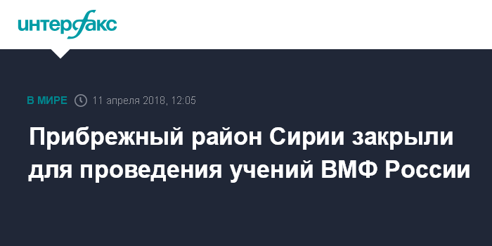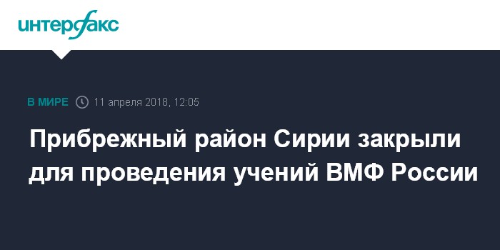 Москва. 11 апреля. INTERFAX.RU - Корабли ВМФ России, начиная с 11 апреля, будут проводить учения вблизи побережья Сирии, следует из международного извещения для авиационного персонала (NOTAM) и навигационного предупреждения для мореплавателей.