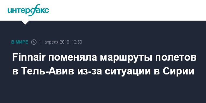 Москва. 11 апреля. INTERFAX.RU - Финская авиакомпания Finnair сообщила в среду об изменении маршрута полетов своих самолетов в Тель-Авив из-за ситуации в Сирии.