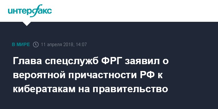 Москва. 11 апреля. INTERFAX.RU - Глава Федеральной службы по охране конституции ФРГ Ханс-Георг Маассен заявил в среду, что с "высокой степенью вероятностью" за кибератаками на серверы германского правительства стояли власти России, сообщают в среду западные СМИ.