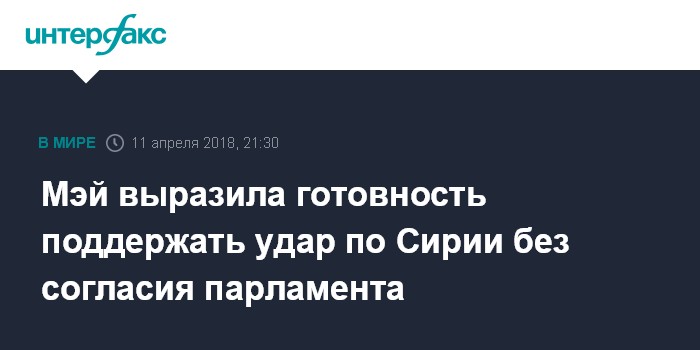 Москва. 11 апреля. INTERFAX.RU - Премьер-министр Великобритании Тереза Мэй готова поддержать военные действия против правительства Сирии без одобрения со стороны британского парламента, передает в среду телерадиокорпорация "Би-би-си" со ссылкой на информированные источники.
