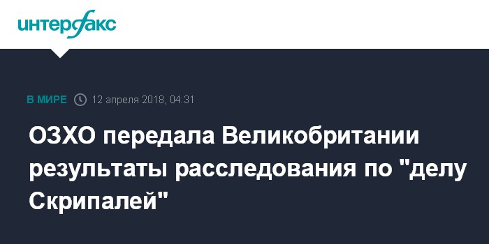 Москва. 12 апреля. INTERFAX.RU - Организация по запрещению химического оружия (ОЗХО) завершила расследование по отравлению Сергея Скрипаля и его дочери Юлии в Солсбери и передала результаты Великобритании, сообщил представитель организации, сообщила газета Daily Star, ссылаясь на британский МИД.