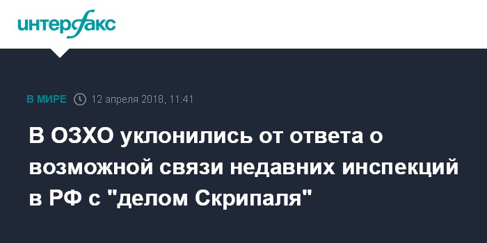 Так в организации ответили на вопрос о том, были ли связаны проведенные в России в конце марта - начале апреля инспекции с отравлением в Солсбери экс-полковника ГРУ Сергея Скрипаля и его дочери Юлии.