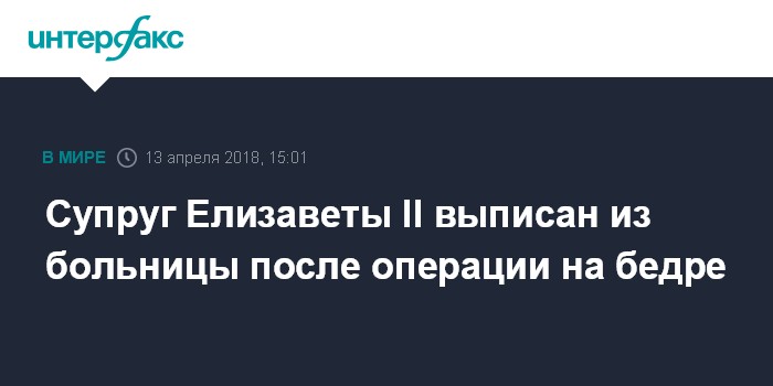 Москва. 13 апреля. INTERFAX.RU - Супруг королевы Великобритании Елизаветы II герцог Эдинбургский Филипп выписался из больницы Короля Эдуарда VII, где ему ранее сделали операцию на бедре, сообщает в пятницу BBC News со ссылкой на Букингемский дворец.