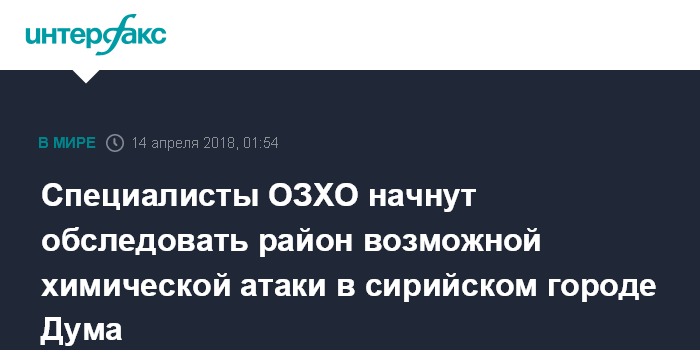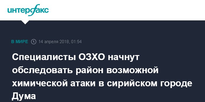 Москва. 14 апреля. INTERFAX.RU - Эксперты Организации по запрещению химического оружия (ОЗХО) в субботу приступят к изучению района возможной химической атаки в сирийском городе Дума. Эксперты ОЗХО прибыли в Сирию 12 и 13 апреля. В свою очередь власти Сирии уже пообещали предоставить им доступ во все районы города Дума, где якобы произошла химатака.