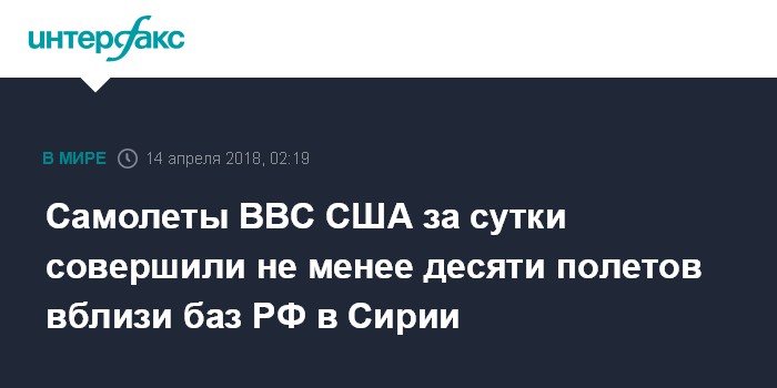Москва. 14 апреля. INTERFAX.RU - Разведывательные самолеты ВМС и ВВС США в течение пятницы, сменяя друг друга, совершили не менее десяти разведывательных полетов вблизи сирийского побережья, где расположены российская авиабаза Хмеймим и база материально-технического обеспечения ВМФ РФ в порту Тартус, следует из мониторинговых данных западных авиационных ресурсов.
