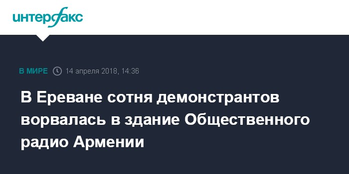 Москва. 14 апреля. INTERFAX.RU - Участники шествия против выдвижения на пост премьер-министра Армении Сержа Саргсяна ворвались в здание Общественного радио Армении в центре Еревана.
