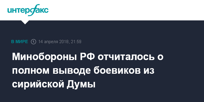 Москва. 14 апреля. INTERFAX.RU - Последние четыре тысячи боевиков с семьями покинули в пятницу сирийскую Думу, заявил начальник российского Центра по примирению враждующих сторон в Сирии Юрий Евтушенко.