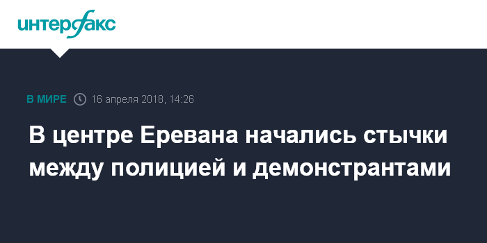 Москва. 16 апреля. INTERFAX.RU - Стычки начались в понедельник между манифестантами и полицией на проспекте Баграмяна в центре Еревана, сообщил корреспондент "Интерфакса".