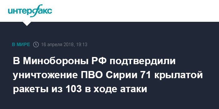 Москва. 16 апреля. INTERFAX.RU - Российские военные подтвердили, что армия Сирии уничтожила 71 из 103 крылатых ракет, которыми западная коалиция атаковала цели в субботу.