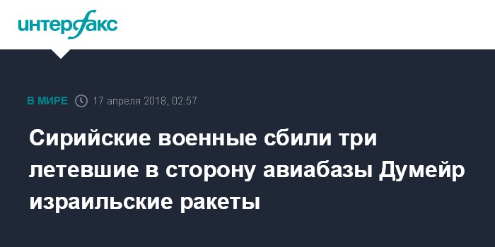 Москва. 17 апреля. INTERFAX.RU - Средства ПВО Сирии сбили три ракеты, выпущенные, предположительно, ВВС Израиля, в сторону авиабазы Думейр близ Дамаска, сообщает арабский портал "Аль-Масдар". По его информации, такие данные распространил арабский телеканал "Аль-Маядин". При этом подтверждения этих данных из других источников не поступало.