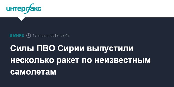 Москва. 17 апреля. INTERFAX.RU - Несколько ракет было пущено сирийскими силами ПВО по неустановленным самолетам, вторгшимся в воздушное пространство страны, сообщил портал "Аль-Масдар".