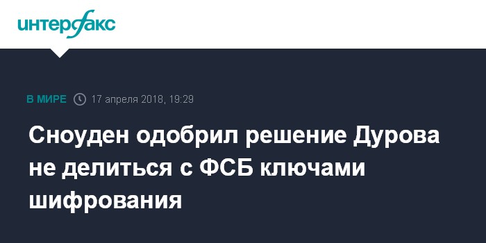 Москва. 17 апреля. INTERFAX.RU - Бывший сотрудник Агентства национальной безопасности (АНБ) США Эдвард Сноуден одобрительно отозвался о решении владельца мессенджера Telegram Павла Дурова не делиться ключами для дешифровки сообщений пользователей по требованию ФСБ.