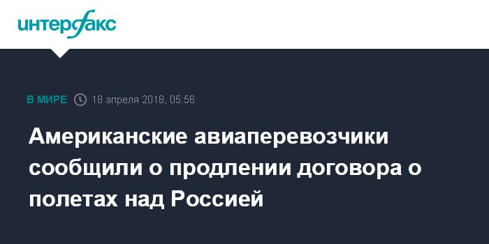 Прежнее соглашение о пролетах истекало во вторник вечером по американскому времени. Ранее в госдепе сообщили, что Россия перенесла встречу, на которой должен был обсуждаться вопрос о продлении договора. Ряд перевозчиков был обеспокоен и приступил к разработке новых маршрутов в облет территории РФ.