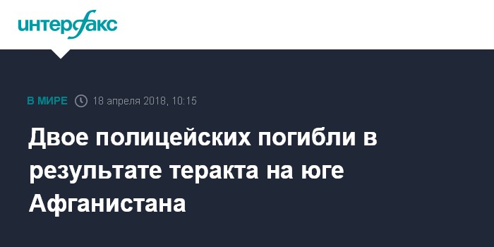 Москва. 18 апреля. INTERFAX.RU - Два сотрудника полиции были убиты, еще два полицейских получили ранения в результате теракта в Кандагаре на юге Афганистана, сообщают в среду местные СМИ.