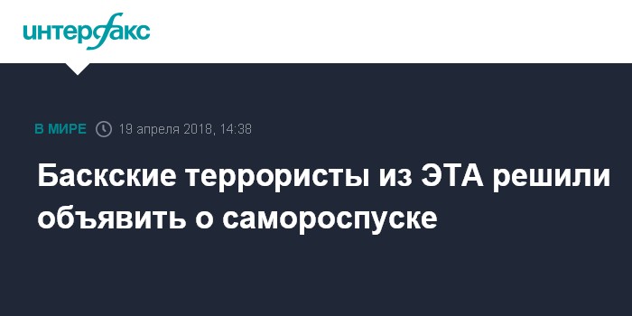 Москва. 19 апреля. INTERFAX.RU - Баскская террористическая организация ЭТА намерена объявить о самороспуске. Ожидается, что это будет сделано 5 мая во французском городе Байоне, передает в четверг испанский телерадиовещатель.