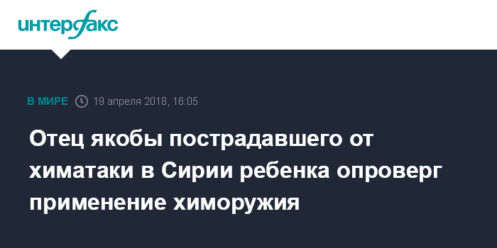Москва. 19 апреля. INTERFAX.RU - Отец сирийского мальчика, задействованного в видео НПО "Белые каски", готов дать показания любым международным организациям о том, что правительственные войска Сирии не применяли в Думе химическое оружие.