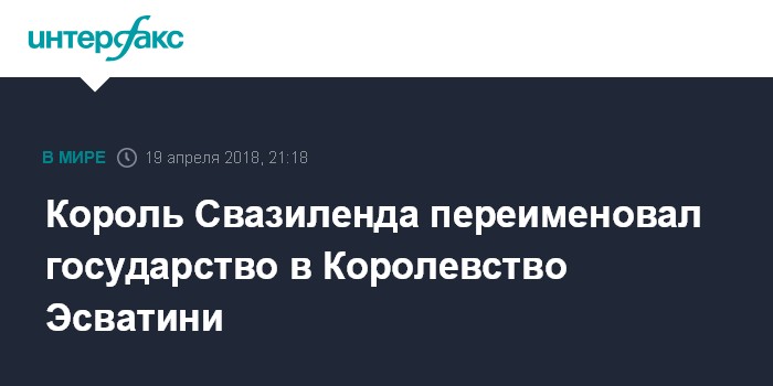 Москва. 19 апреля. INTERFAX.RU - Король африканского государства Свазиленд Мсвати III переименовал его в Королевство Эсватини, передает в четверг "Би-би-си".