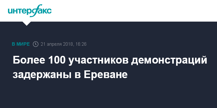 Москва. 21 апреля. INTERFAX.RU - Сотрудники полиции в Ереване в субботу доставили в отделения более сотни сторонников оппозиции, перекрывавших дороги для проезда автотранспорта в спальных районах столицы.