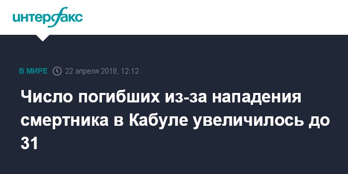 Москва. 22 апреля. INTERFAX.RU - До 31 возросло число жертв нападения смертника на центр регистрации избирателей в Кабуле в воскресенье, более 50 человек получили ранения, сообщает британская телерадиокорпорация BBC со ссылкой на представителей властей Афганистана.