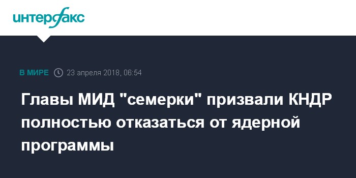 Москва. 23 апреля. INTERFAX.RU - Министры иностранных дел стран "большой семерки" на встрече в Торонто продемонстрировали единство в том, что нельзя мириться с наличием ядерного оружия у КНДР, заявил журналистам министр иностранных дел Японии Таро Коно.