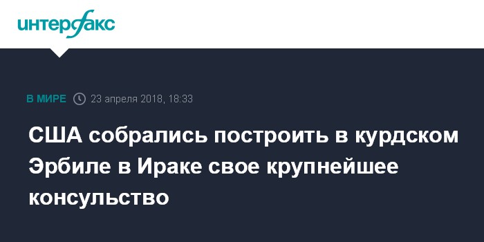 Москва. 23 апреля. INTERFAX.RU - Посол США в Ираке Дуглас Силлиман во время поездки в Эрбиль, центральный город курдского региона страны, объявил о планах США построить на территории иракского Курдистана крупнейшее американское консульство, передает телеканал "Рудау".