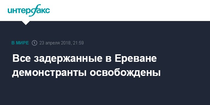 Москва. 23 апреля. INTERFAX.RU - Задержанные в ходе массовых демонстраций против назначения на пост премьер-министра Армении Сержа Саргсяна демонстранты освобождены, сообщил "Интерфаксу" в понедельник пресс-секретарь полиции Армении Ашот Агаронян.