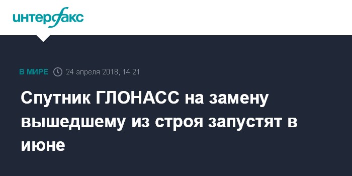 Москва. 24 апреля. INTERFAX.RU - Россия запустит летом новый спутник ГЛОНАСС-М взамен вышедшего из строя 19 апреля космического аппарата, сообщил "Интерфаксу" источник в ракетно-космической отрасли.