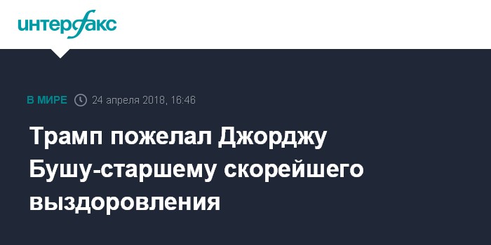 Москва. 24 апреля. INTERFAX.RU - Президент США Дональд Трамп обратился со словами поддержки к 41-му президенту Джорджу Бушу, которому в ночь на 24 апреля потребовалась медицинская помощь из-за попадания в кровь инфекции.