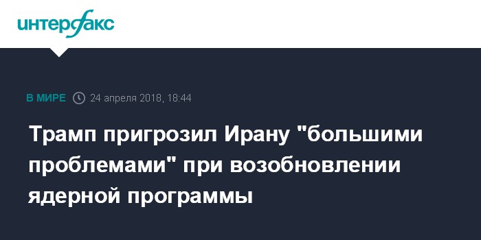 "Они ничего не возобновят (ядерную программу - ИФ). Если они сделают это, у них будут огромные проблемы, больше, чем когда-либо", - сказал Трамп.