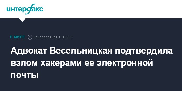 Москва. 25 апреля. INTERFAX.RU - Адвокат Наталья Весельницкая подтвердила сведения о взломе американскими хакерами ее электронной почты, шантаже и заявила о намерении обратиться в правоохранительные органы.