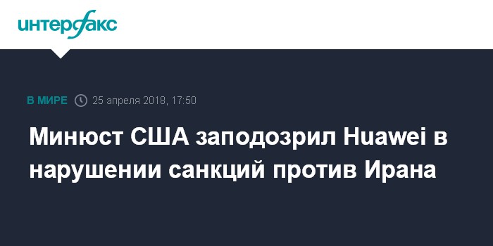 Москва. 25 апреля. INTERFAX.RU - Министерство юстиции США проводит расследование в связи с потенциальным нарушением китайской компанией Huawei американских санкций против Ирана, сообщили The Wall Street Journal информированные источники.