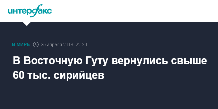 Москва. 25 апреля. INTERFAX.RU - Почти 63 тыс. сирийцев вернулись в освобожденный от боевиков пригород Дамаска Восточная Гута, сообщил начальник российского центра по примирению враждующих сторон в Сирии генерал-майор Юрий Евтушенко.