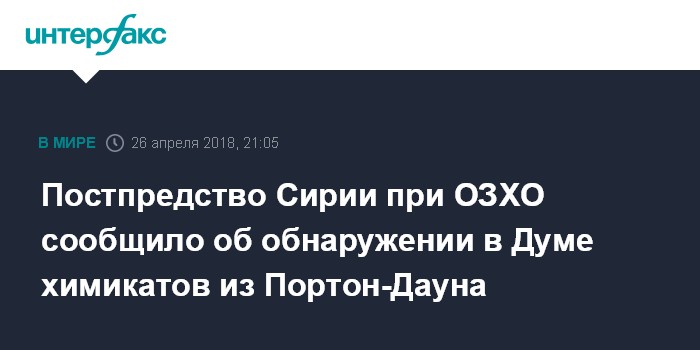 Москва. 26 апреля. INTERFAX.RU - Химикаты из лаборатории Портон-Даун в Солсбери были найдены в оставленном террористами в сирийской Думе хранилище химоружия, заявил заместитель постпреда Сирии при Организации по запрещению химического оружия Гасан Абейд.