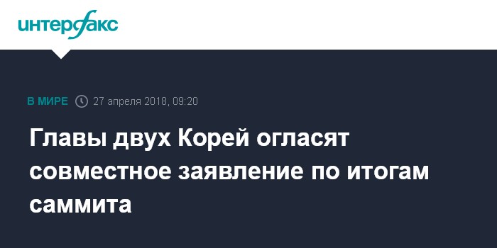 Москва. 27 апреля. INTERFAX.RU - По итогам межкорейского саммита лидеры Южной Кореи и КНДР огласят совместное заявление, сообщил журналистам представитель южнокорейской администрации.