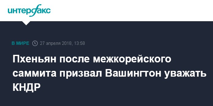 Москва. 27 апреля. INTERFAX.RU - По итогам межкорейского саммита Пхеньян призывает Вашингтон относиться к КНДР без высокомерия и с уважением, говорится в сообщении, распространенном по каналам агентства ЦТАК после завершения переговоров лидеров КНДР и Южной Кореи Ким Чен Ына и Мун Чжэ Ина.