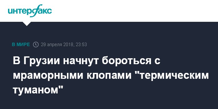 Москва. 29 апреля. INTERFAX.RU - Национальное агентство продовольствия министерства охраны окружающей среды и сельского хозяйства Грузии в рамках борьбы с мраморным клопом (азиатский щитник) с утра понедельника приступит к дезинфекционной обработке территорий в трех регионах на западе страны - Самегрело, Гурия и Имерети.