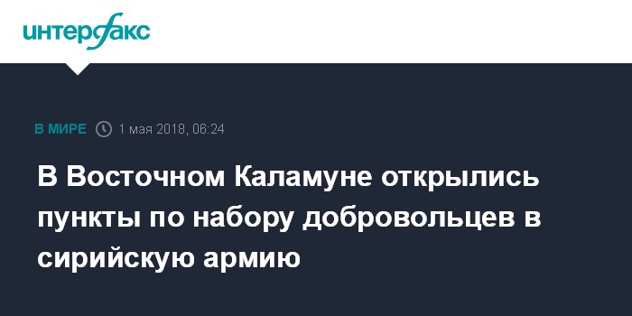 Москва. 1 мая. INTERFAX.RU - Пункты по набору добровольцев в вооруженные силы Сирийской Арабской Республики открылись в городах анклава Восточный Каламун, в городе Эр-Рухайб на мобильных призывных пунктах наблюдаются очереди.