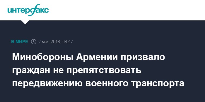 Москва. 2 мая. INTERFAX.RU - Министерство обороны Армении призывает жителей Еревана и областей не препятствовать передвижению военного транспорта.