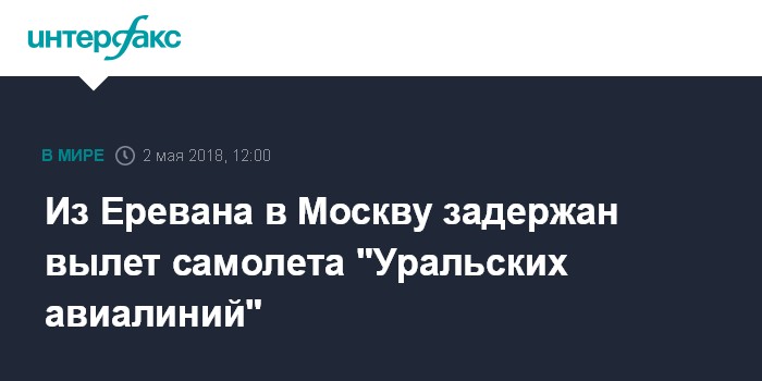 Москва. 2 мая. INTERFAX.RU - Вылет самолета российской компании "Уральские авиалинии" рейсом Ереван-Москва задержан, сообщается на официальном табло ереванского международного аэропорта "Звартноц".