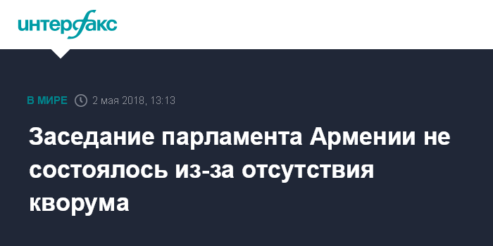 Москва. 2 мая. INTERFAX.RU - Заседание парламента Армении в среду не состоялось из-за неявки депутатов, перед началом встречи зарегистрировалось 33 депутата, в то время как для обеспечения кворума необходимо присутствие 53 депутатов, сообщает корреспондент "Интерфакса".