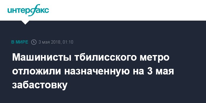 Москва. 3 мая. INTERFAX.RU - Машинисты тбилисского метрополитена, которые с утра 3 мая планировали приступить к забастовке из-за невыполнения транспортной компанией их требования о повышении зарплаты, решили отложить на месяц свою акцию, сообщает в ночь на четверг независимый профсоюз метрополитеновцев "Эртоба 2013".
