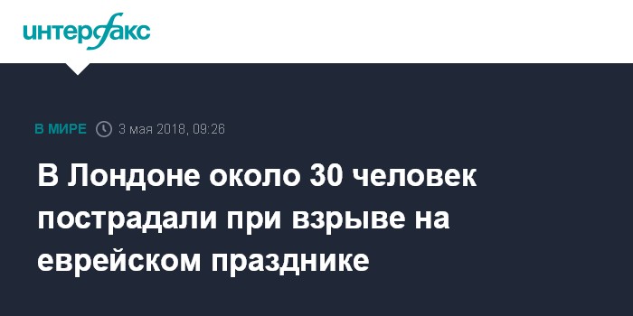 Москва. 3 мая. INTERFAX.RU - В Лондоне во время мероприятий в честь празднования еврейского праздника Лаг ба-Омер, который отмечается 2-3 мая, произошел взрыв, сообщает Daily Mail.