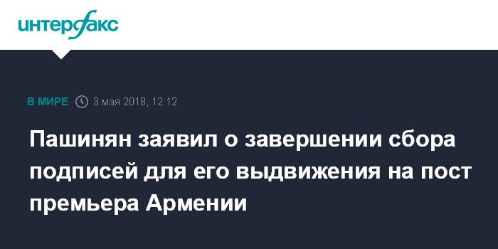 Москва. 3 мая. INTERFAX.RU - Лидер протестного движения Армении, руководитель оппозиционной парламентской фракции "Елк" Никол Пашинян сообщил, что необходимые для выдвижения его кандидатуры на пост премьера подписи депутатов уже собраны.