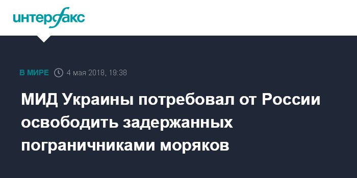 Москва. 4 мая. INTERFAX.RU - Министерство иностранных дел Украины потребовало освободить экипаж и рыболовное судно, задержанное в акватории Черного моря российскими пограничниками.