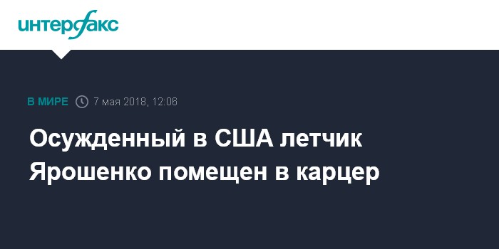 Москва. 7 мая. INTERFAX.RU - Российский летчик Константин Ярошенко, отбывающий 20-летний срок в американской тюрьме "Форт-Дикс", 30 апреля был помещен на месяц в карцер за драку, сообщила "Интерфаксу" супруга летчика Виктория Ярошенко.