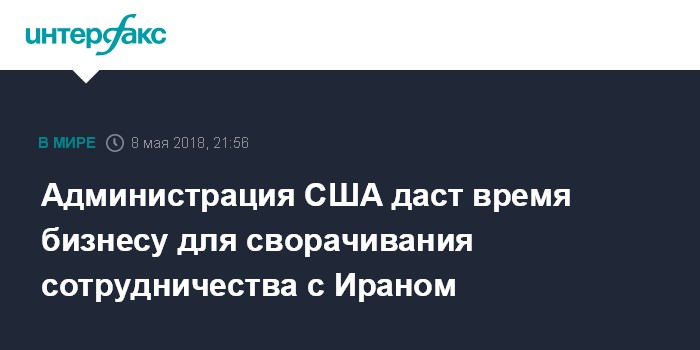 Москва. 8 мая. INTERFAX.RU - Администрация США в свете своего решения возобновить действие санкций, связанных с иранской ядерной программой, предоставляет всем сторонам, занимающимся коммерческой деятельностью с Ираном, время для ее прекращения, говорится в заявлении Белого дома.