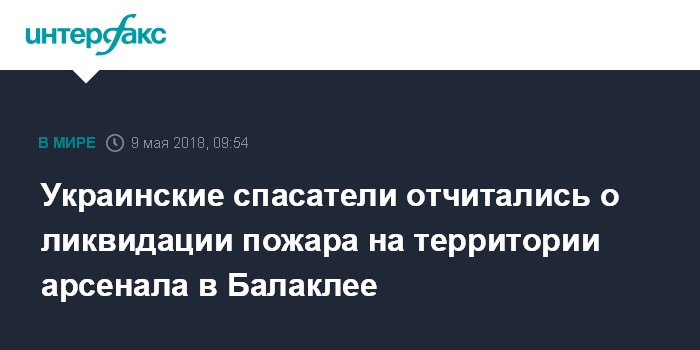 Москва. 9 мая. INTERFAX.RU - Пожар в городе Балаклея (Харьковская область) на технической территории военного арсенала министерства обороны ликвидирован в 17 часов 8 мая, сообщила пресс-служба Госслужбы по ЧС в среду.