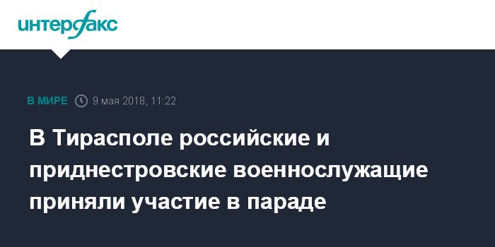 Москва. 9 мая. INTERFAX.RU - В Тирасполе в честь Дня Победы на центральной площади Суворова состоялся совместный парад военнослужащих силовых ведомств Приднестровья и Оперативной группы российских войск (ОГРВ).