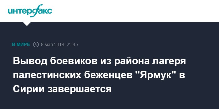 Москва. 9 мая. INTERFAX.RU - Российские военные в Сирии завершают вывод боевиков из восточных районов бывшего лагеря палестинских беженцев "Ярмук" через гуманитарный коридор "Бейт-Сахм", сообщил на брифинге в среду начальник Центра по примирению враждующих сторон в республике генерал-майор Юрий Евтушенко.
